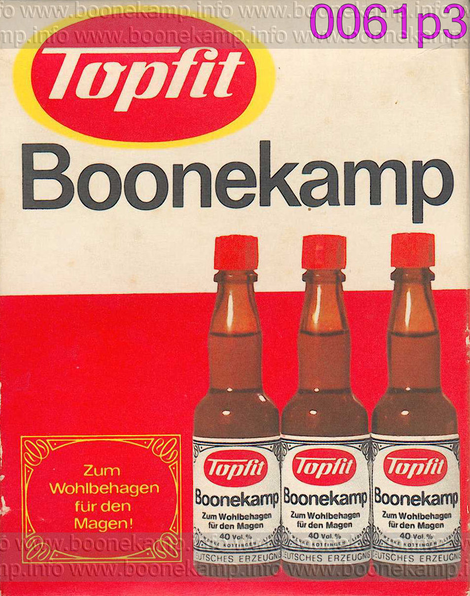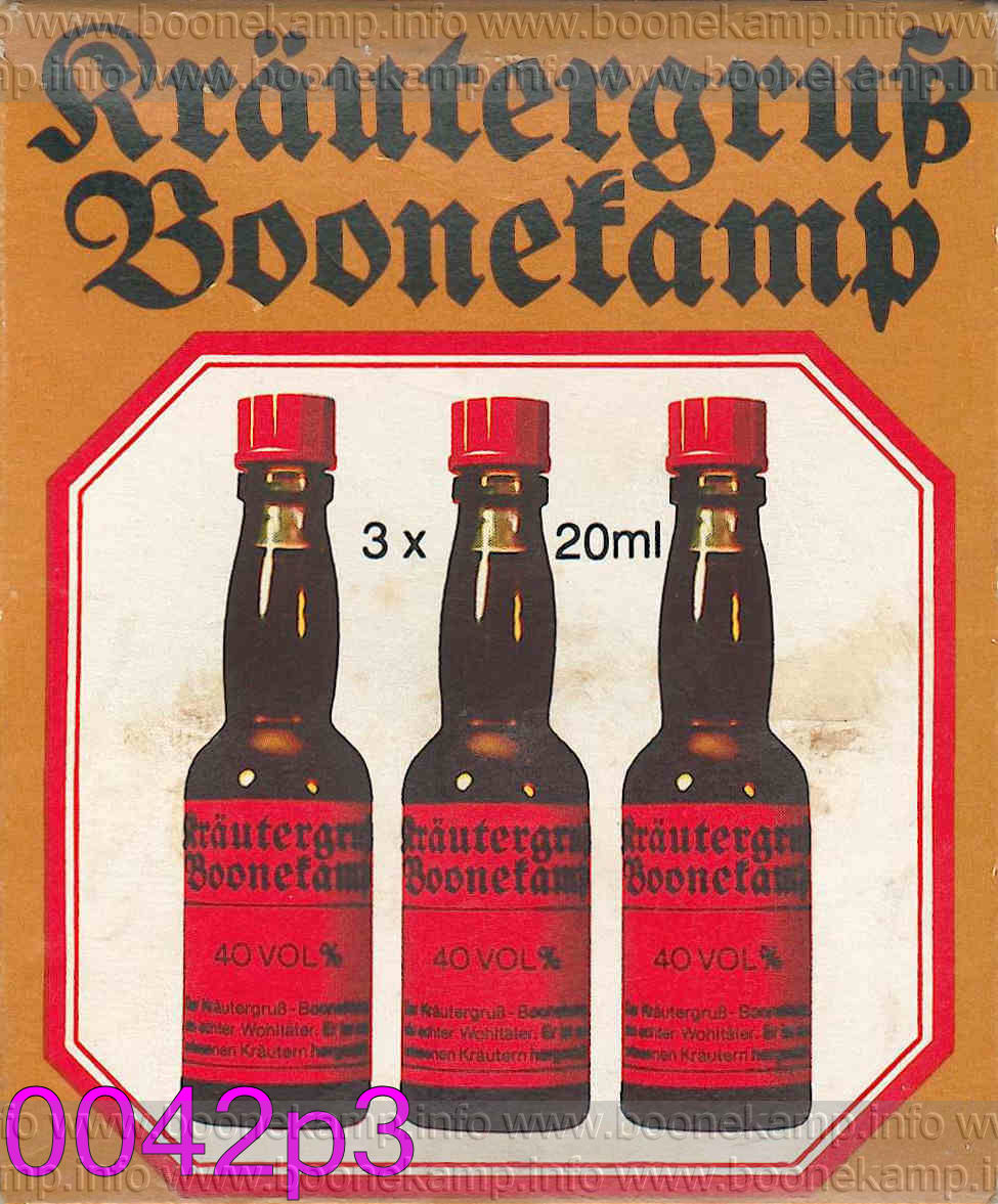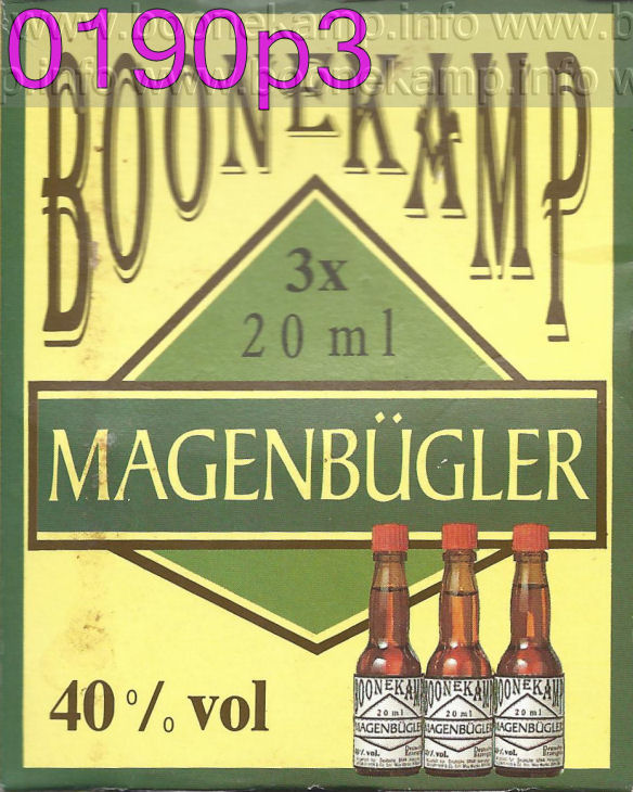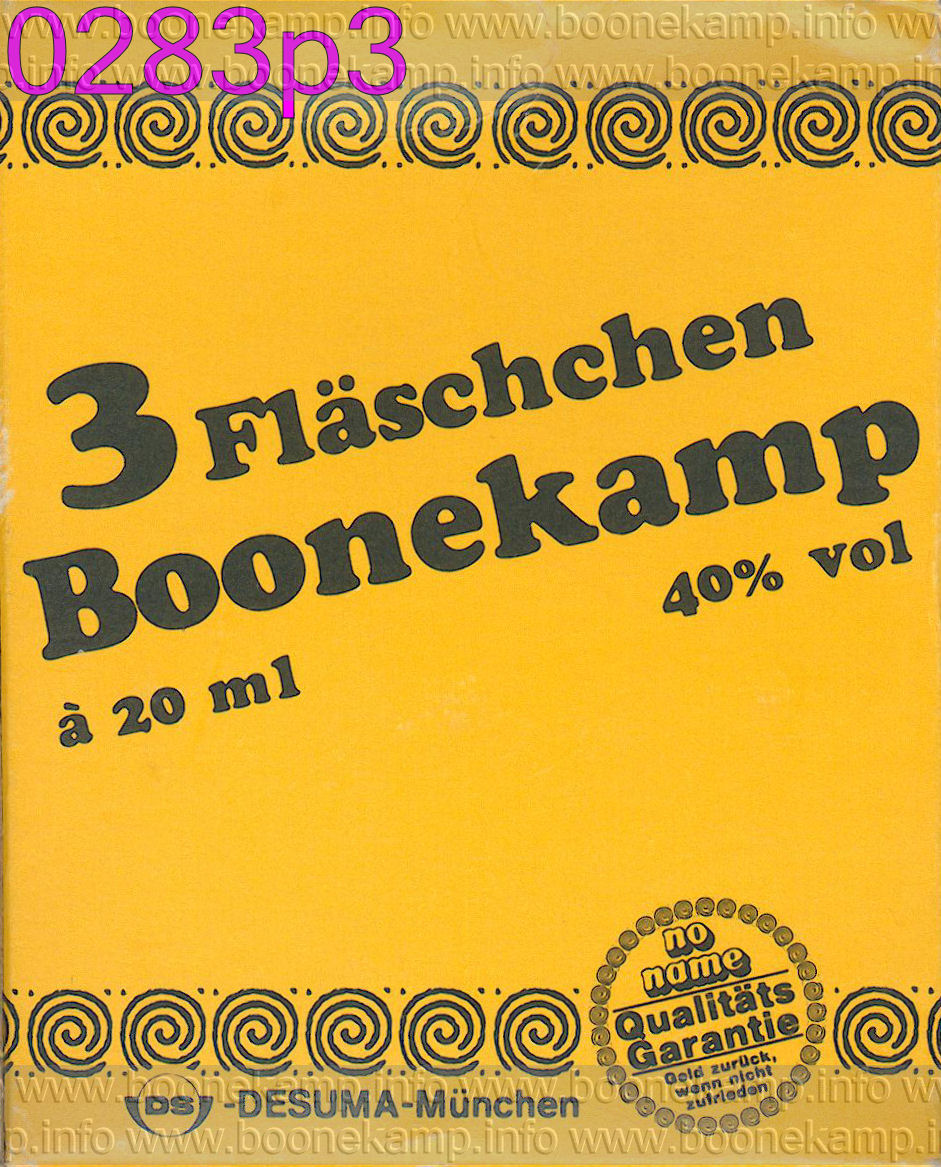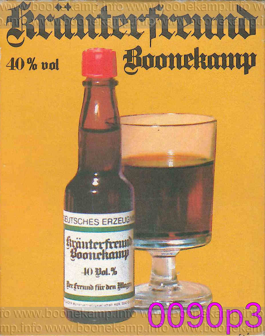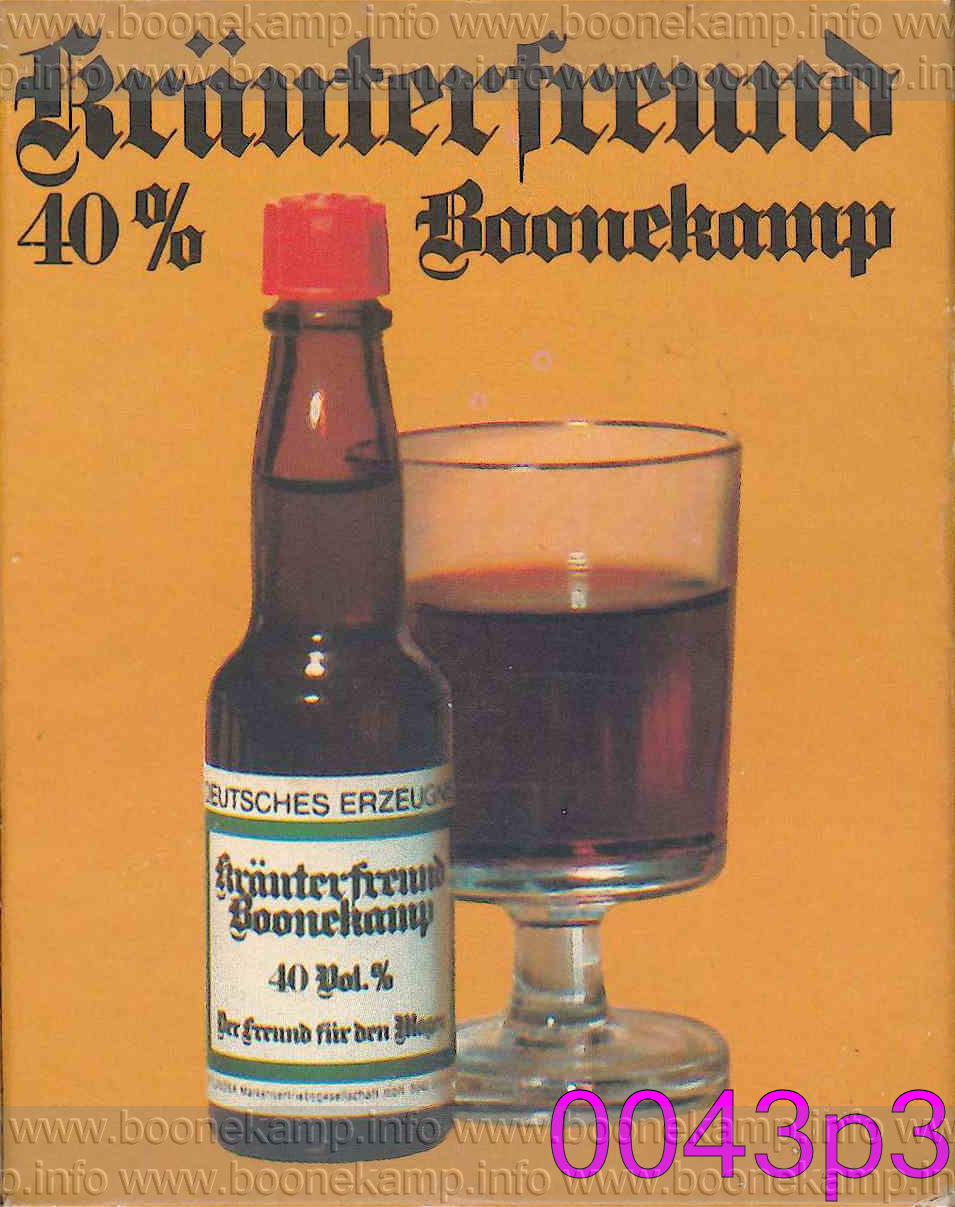 Erläuterung: Jede Boonekamp-Flasche bzw. Packung hat zur Identifikation eine fortlaufende Nummer erhalten (ID). In einigen Fällen sind die Unterschiede nur geringfügig (z.B. abweichende Werbetexte, Herstellerangaben, usw). Nähere Informationen dazu in der Datenbankliste.