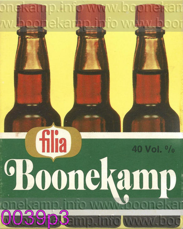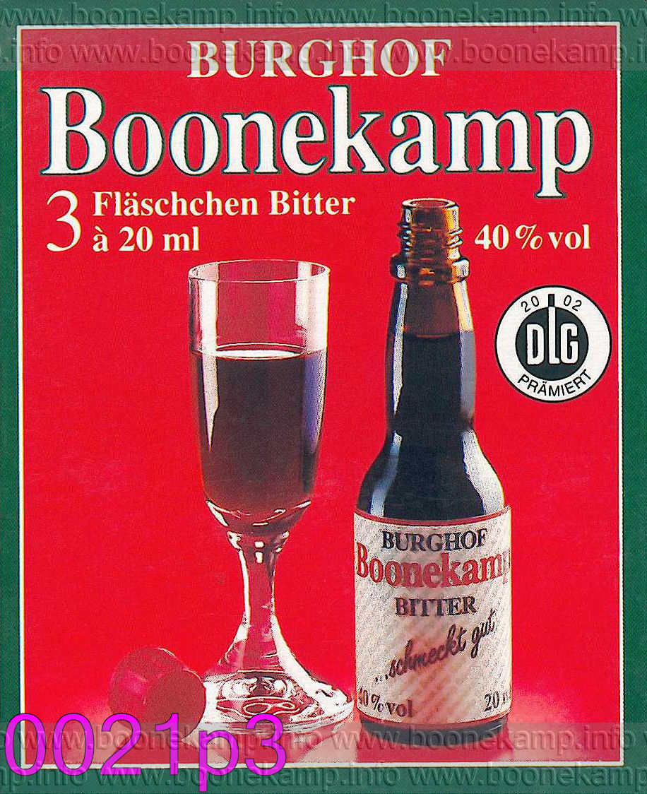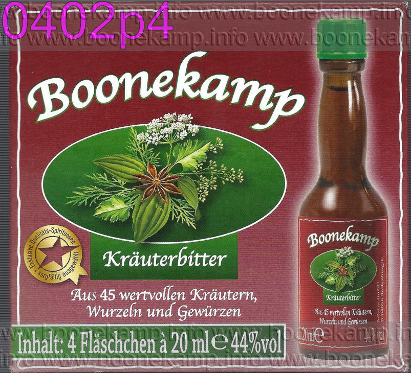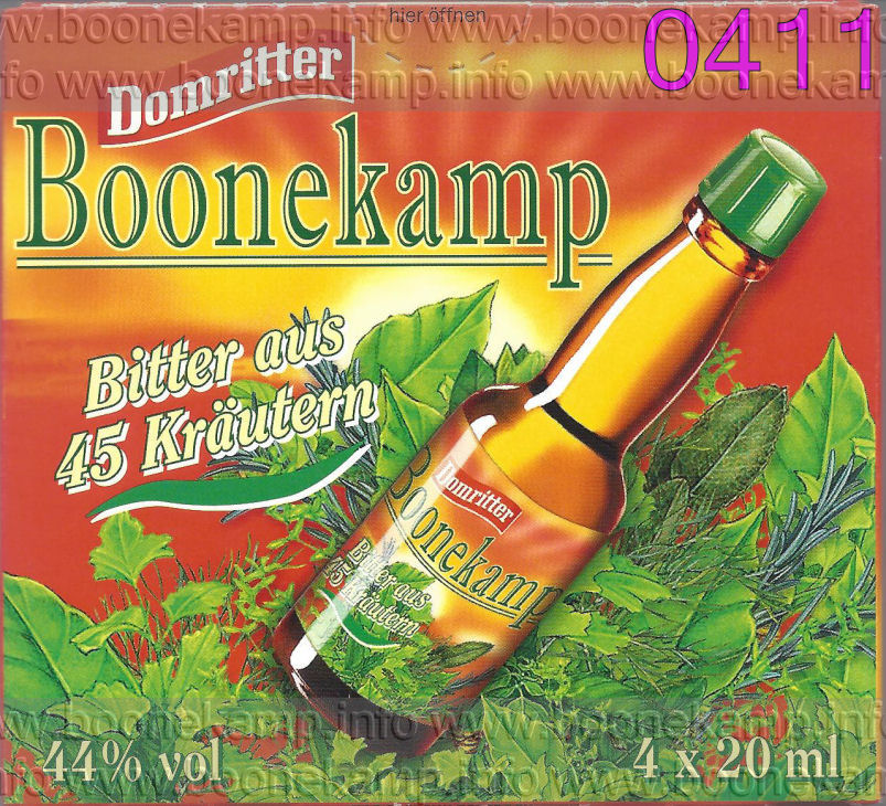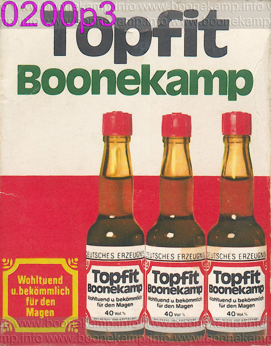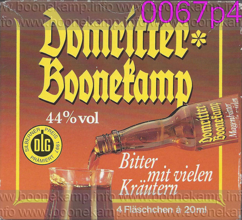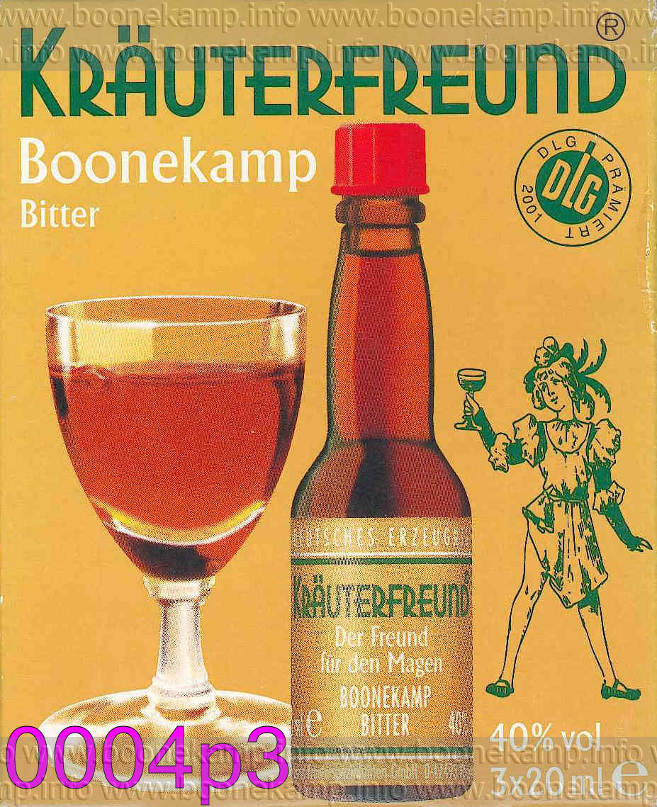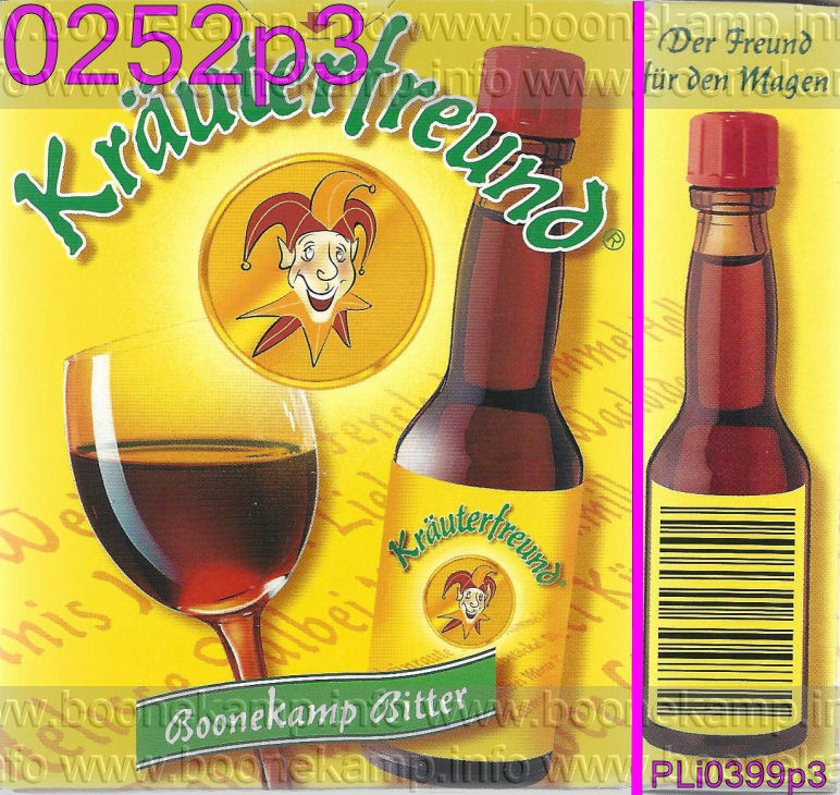 Erläuterung: Jede Boonekamp-Flasche bzw. Packung hat zur Identifikation eine fortlaufende Nummer erhalten (ID). In einigen Fällen sind die Unterschiede nur geringfügig (z.B. abweichende Werbetexte, Herstellerangaben, usw). Nähere Informationen dazu in der Datenbankliste.